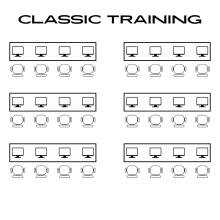 Integrated Podium with computer/projector/overhead speakers includes internet connection, microsoft office, and screen recording capability; and elevated stage. Workstations in Classic Training Set-Up include internet connection, microsoft office and Sierra.